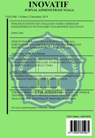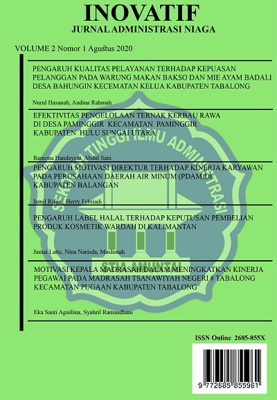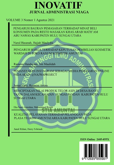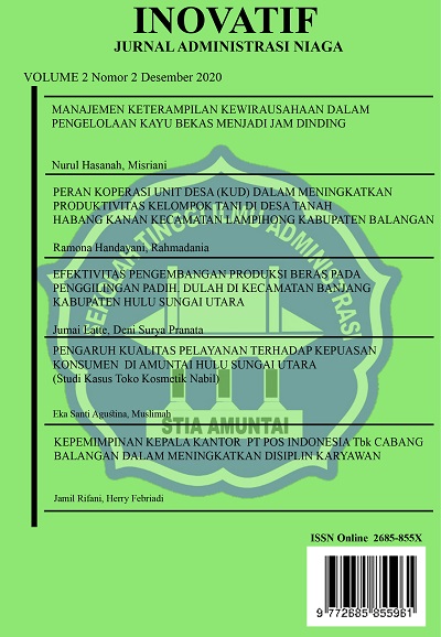 Inovatif Jurnal Administrasi NiagaVol 2 No 2 (2020)Jurnal Inovatif di terbitkan oleh Program Studi : Administrasi Niaga pada Sekolah Tinggi Ilmu Administrasi (STIA) Amuntai sebagai media untuk menyalurkan pemahaman tentang aspek - aspek Administrasi niaga dalam era Indusrti 4.0 dan juga informasi berupa hasil penelitian lapangan atau studi pustaka. Jurnal ini diterbitkan dua kali dalam setahun yaitu pada bulan Juli dan Desember.Redaksi menerima naskah yang belum pernah diterbitkan dalam media lain dari Dosen,peneliti,mahasiswa maupun praktisi dengan ketentuan penulisan seperti tercantum pada halaman belakang ( petunjuk untuk penulis ).Naskah yang masuk akan di evaluasi dan di sunting unutk keseragaman format, istilah dan tata cara lainnya.