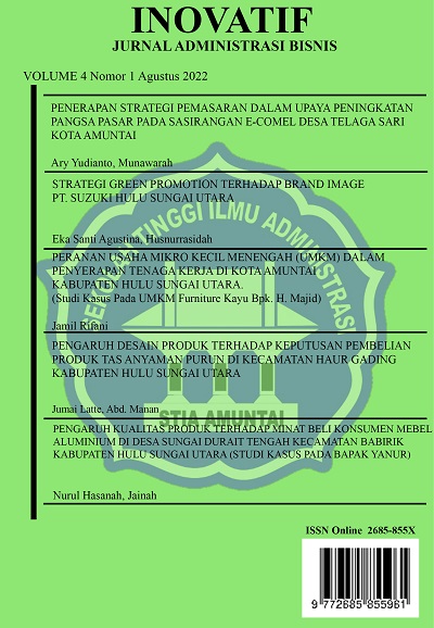 Inovatif Jurnal Administrasi NiagaVol 4 No 2 (2022)Jurnal Inovatif di terbitkan oleh Program Studi : Administrasi Bisnis pada Sekolah Tinggi Ilmu Administrasi Amuntai sebagai media untuk menyalurkan pemahaman tentang aspek - aspek Administrasi Bisnis dalam era Indusrti 4.0 dan juga informasi berupa hasil penelitian lapangan atau studi pustaka. Jurnal ini diterbitkan dua kali dalam setahun yaitu pada bulan Juli dan Desember.Redaksi menerima naskah yang belum pernah diterbitkan dalam media lain dari Dosen,peneliti,mahasiswa maupun praktisi dengan ketentuan penulisan seperti tercantum pada halaman belakang ( petunjuk untuk penulis ).Naskah yang masuk akan di evaluasi dan di sunting unutk keseragaman format, istilah dan tata cara lainnya