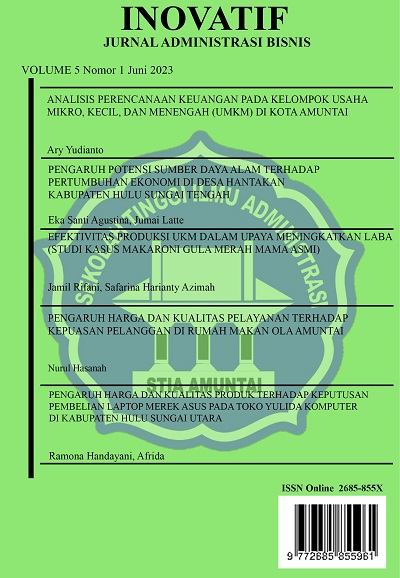 Inovatif Jurnal Administrasi NiagaVol 5 No 1 (2023)Jurnal Inovatif di terbitkan oleh Program Studi : Administrasi Bisnis pada Sekolah Tinggi Ilmu Administrasi Amuntai sebagai media untuk menyalurkan pemahaman tentang aspek - aspek Administrasi Bisnis dalam era Indusrti 4.0 dan juga informasi berupa hasil penelitian lapangan atau studi pustaka. Jurnal ini diterbitkan dua kali dalam setahun yaitu pada bulan Juli dan Desember.Redaksi menerima naskah yang belum pernah diterbitkan dalam media lain dari Dosen,peneliti,mahasiswa maupun praktisi dengan ketentuan penulisan seperti tercantum pada halaman belakang ( petunjuk untuk penulis ).Naskah yang masuk akan di evaluasi dan di sunting unutk keseragaman format, istilah dan tata cara lainnya.